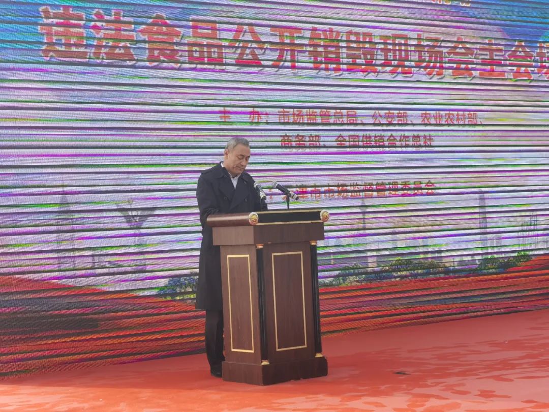 今日,由國家市場監(jiān)管總局、公安部、農(nóng)業(yè)農(nóng)村部、商務(wù)部、中華全國供銷合作總社五部門聯(lián)合主辦的“農(nóng)村假冒偽劣食品專項執(zhí)法行動違法食品公開銷毀現(xiàn)場會”以視頻連線方式在北京召開,天津食品集團作為唯一一家企業(yè)代表受邀參加天津主會場會議,集團黨委副書記、總經(jīng)理趙國榮出席并代表集團發(fā)言。