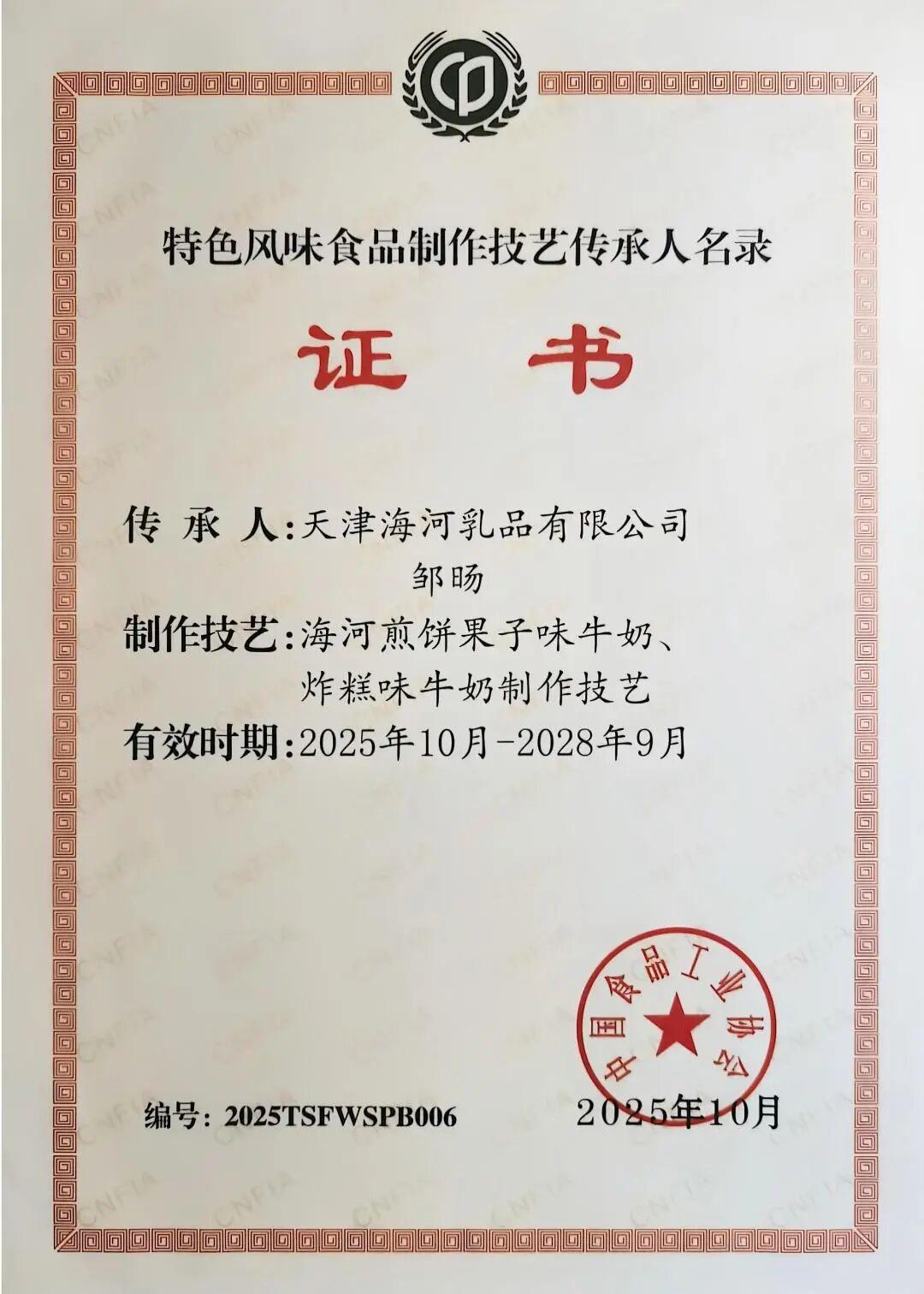 近日,中國(guó)食品工業(yè)協(xié)會(huì)公布第二批“特色風(fēng)味食品標(biāo)志性產(chǎn)品、制作技藝傳承人名錄”。海河乳品公司黨委書(shū)記、董事長(zhǎng)鄒旸榮獲“特色風(fēng)味食品制作技藝傳承人”稱(chēng)號(hào)。煎餅果子味牛奶、炸糕味牛奶榮膺“特色風(fēng)味食品標(biāo)志性產(chǎn)品”。這一由國(guó)家行業(yè)權(quán)威組織、經(jīng)專(zhuān)家多輪評(píng)審認(rèn)定的成果,標(biāo)志著海河乳品公司在傳承與創(chuàng)新地域特色食品、推動(dòng)傳統(tǒng)風(fēng)味現(xiàn)代化轉(zhuǎn)型方面走在了行業(yè)前列,為老字號(hào)品牌注入了強(qiáng)勁動(dòng)能。