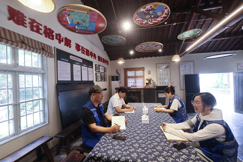 6月18日,在嘉興市秀洲區(qū)王店鎮(zhèn)慶豐村網(wǎng)格議事站內(nèi),網(wǎng)格長(zhǎng)、網(wǎng)格員們召開網(wǎng)格議事會(huì),討論村里目前碰到的新情況。新華社記者 徐昱 攝